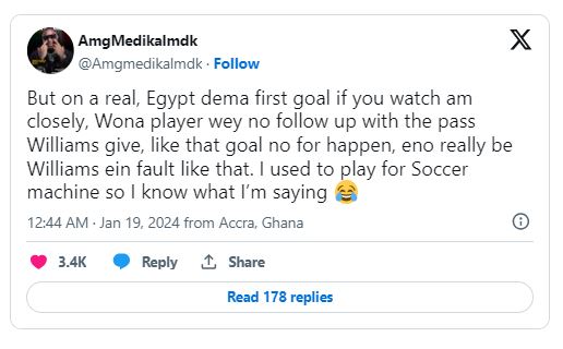He's HIM Mohammed Kudus Inaki Williams Richard Ofori Kudus Osman Bukari Salisu West Ham Mozambique #EGYGHA Countryman Songo Chris Hughton Man of the Match Semenyo Richmond Lamptey Baba Iddrisu pic.twitter.com/rCrD5tONAI— Adom 106.3 FM (@Adom1063fm) January 18, 2024