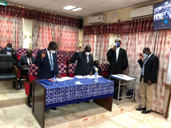 Mr. Solomon Faakye (Esq), the Legal Counsel for UCC, sworn the Board Members present (physical and online) into office supported by Madam Anastasia Asante (Esq) of the same office. Each Board Member took the Oath of Office and Secrecy, pledging commitment to discharge their Board functions to the best of their abilities.