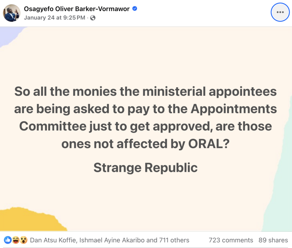 In the first post, dated 24th January at 9:25 pm, Barker-Vormawor wrote: “So all the money the ministerial appointees are being asked to pay to the Appointments Committee just to get approved, are those ones not affected by the ORAL?”