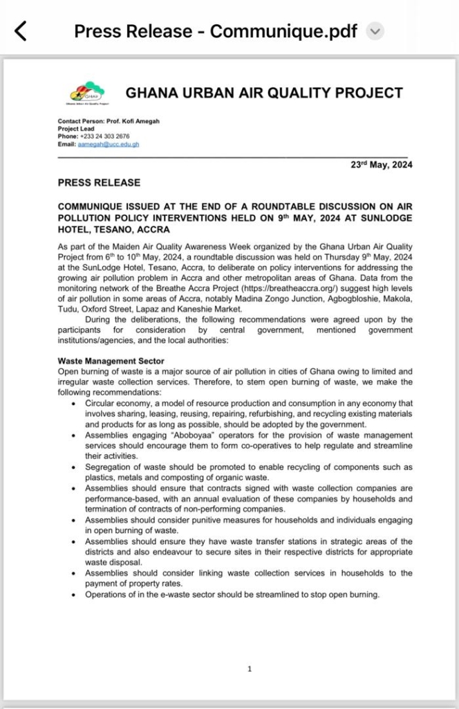 Open burning of waste, a major source of air pollution in Ghanaian cities due to limited and irregular collection services, was a key focus at the roundtable discussion during Air Quality Awareness Week. Participants recommended that the government adopt a circular economy model to promote the reuse and recycling of materials. Assemblies were advised to encourage "Aboboyaa" operators to form co-operatives for better regulation and to promote waste segregation to facilitate recycling. Contracts with waste collection companies should be performance-based, with regular evaluations, and punitive measures should be implemented for those engaging in open burning. Additionally, the establishment of strategic waste transfer stations, linking waste collection services to property rates, and regulating e-waste sector operations to prevent open burning were recommended.