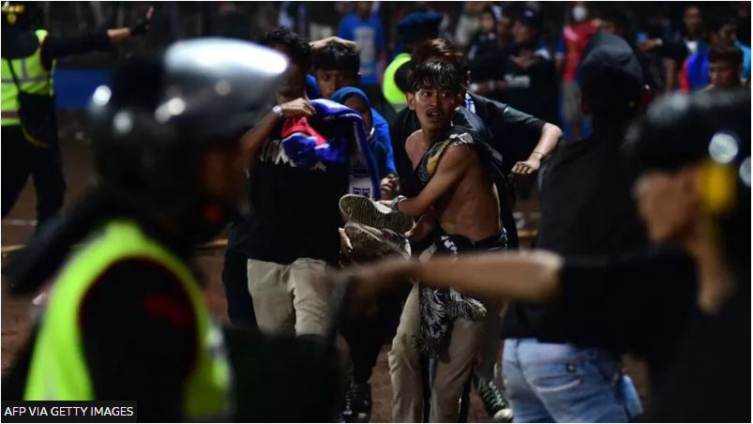 One eyewitness told the BBC that police had fired numerous gas rounds "continuously and fast" after the situation with fans became "tense". Home team Arema FC supporters ran onto the pitch when the match ended in a 3-2 defeat to their rivals Persebaya Surabaya.