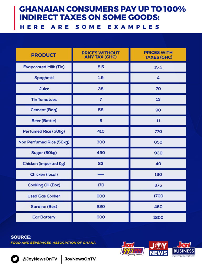 The Food and Beverages Association of Ghana has revealed the excessively steep indirect taxes and levies imposed on essential goods for Ghanaian consumers. In a press release issued by the association, it was disclosed that consumers are bearing the burden of up to a 100% increase in the prices of certain items due to various government-imposed taxes. The statement offers numerous instances highlighting the alarming price inflation directly caused by these taxes.