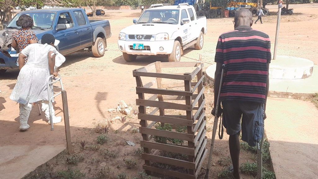 Isaac Baah, 36, a farmer at Adamsu, struggles to take care of himself, his wife, and three children after a car accident led to an amputated leg that has rendered him unable to walk on his own and work.