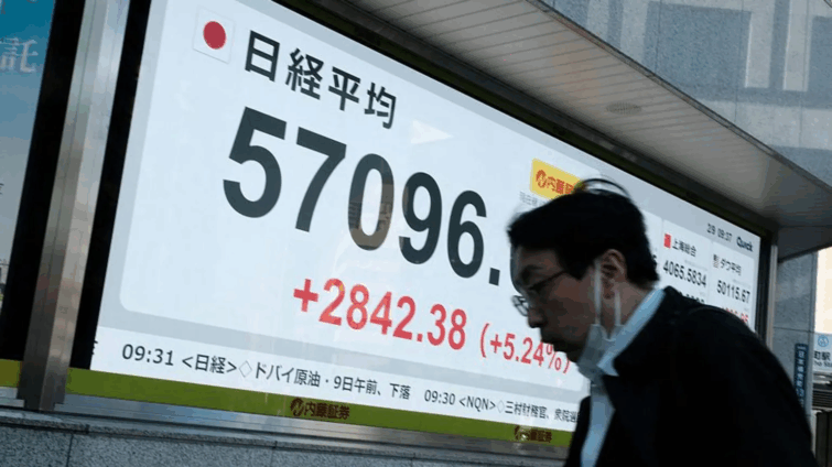 The Nikkei 225 index rallied by more than 5% in early trade on Monday, briefly crossing the 57,000 mark for the first time. It then gave up some gains, but still closed up 3.9% at a record high of 56,363.94.