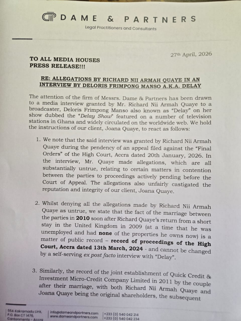 The response comes after Mr Quaye’s appearance on the Delay Show on Saturday, April 25, where he made claims about his former marriage and business dealings. The interview has since generated wide public debate on traditional and social media platforms.