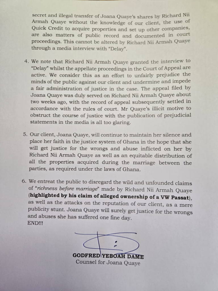 “Whilst denying all the allegations made by Richard Nii Armah Quaye as untrue, we state that the fact of the marriage between the parties in 2010 is a matter of public record and cannot be changed by a self-serving ex post facto interview,” the statement said.