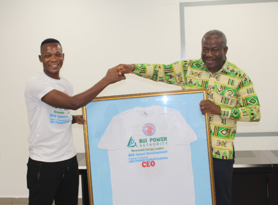 Former Black Stars Footballer, John Paintsil, who runs the John Paintsil Football Academy (JPFA), has presented a jersey to the Chief Executive Officer of the Bui Power Authority (BPA), Samuel Kofi Dzamesi.