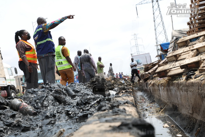 After a brief misunderstanding between the sellers and the Director of AMA Environmental Health Department, Madam Florence Kuukyi, they were compelled to clean the gutter and issued with caution notes.