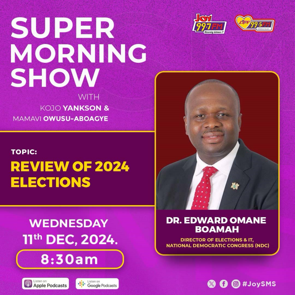 On Wednesday, December 11, Joy FM’s Super Morning Show, Ghana’s flagship morning programme, will host a special edition featuring Dr. Edward Omane Boamah, the Director of Election Monitoring and IT for the National Democratic Congress (NDC).