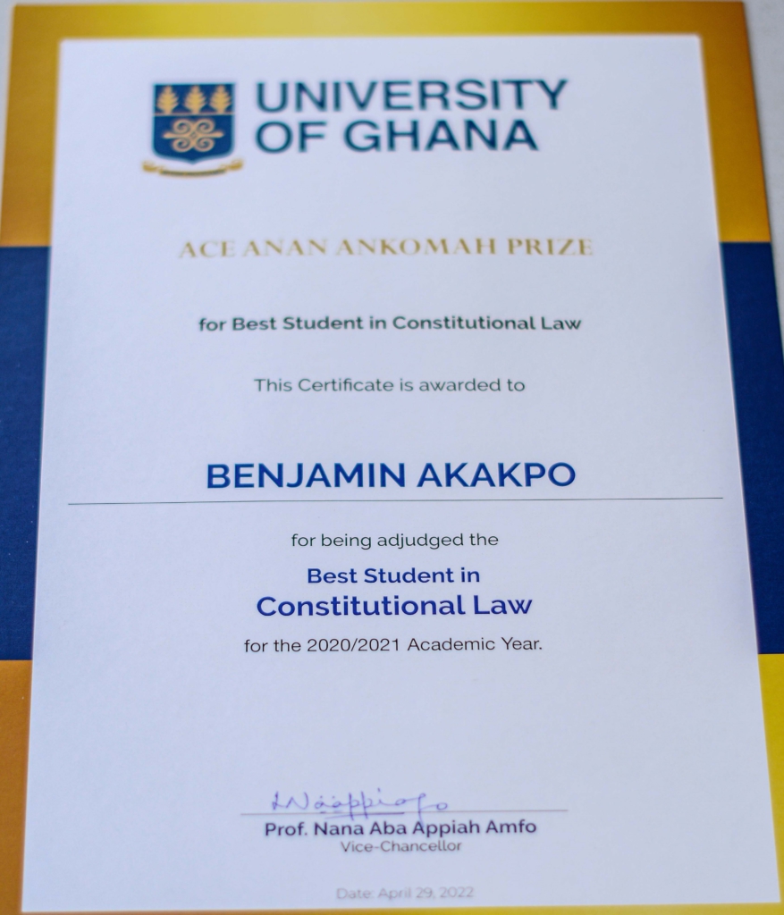 A co-host of JoyNews’ AM Show, Benjamin Akakpo, has been adjudged the 2020/2021 Best Student in Constitutional Law at University of Ghana School of Law (UGSoL).