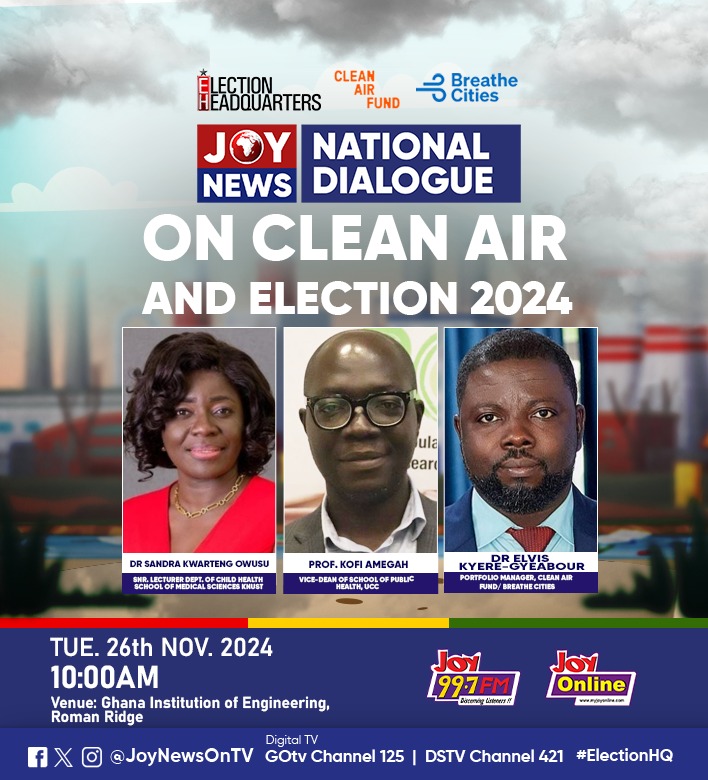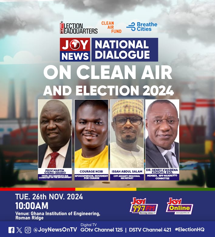 The event, titled The JoyNews National Dialogue on Clean Air, will take place on November 26, 2024, at the Ghana Institution of Engineering. It will be broadcast live on JoyNews to encourage political parties to prioritize clean air in their manifestos.