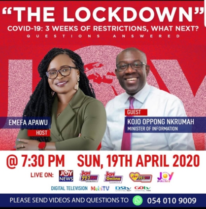 In view of this the Information Minister, Kojo Oppong Nkrumah is once again coming on JoyNews to answer citizens’ questions and concerns about the lockdown and its extension, in another episode of 'The Lockdown'.