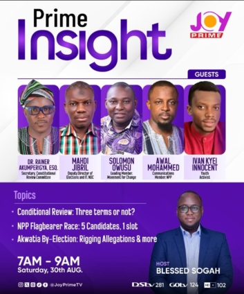 The programme, which airs live on JoyPrime and across all Multimedia Limited social media platforms, will feature in-depth discussions on three major topics: the ongoing debate over a presidential three-term limit, the fierce contest among five New Patriotic Party (NPP) candidates, and the Akwatia by-election.