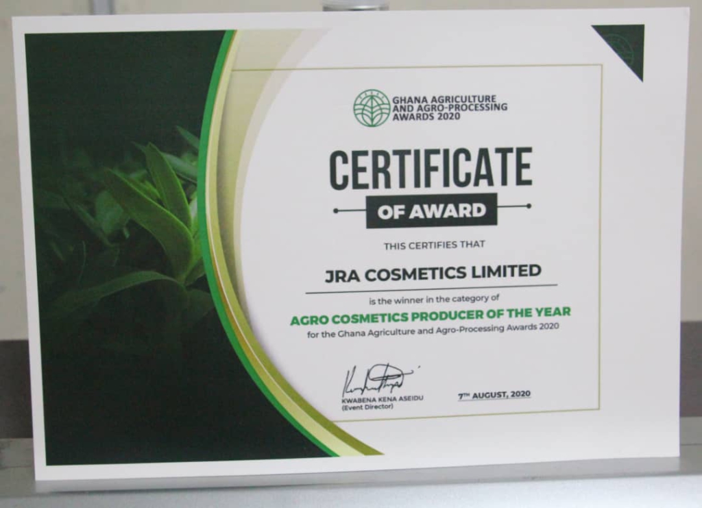 Takoradi-based JRA Cosmetics has won the best Agro Cosmetics Producer of the Year at this year's Ghana Agriculture and Agro-Processing Company of Awards.