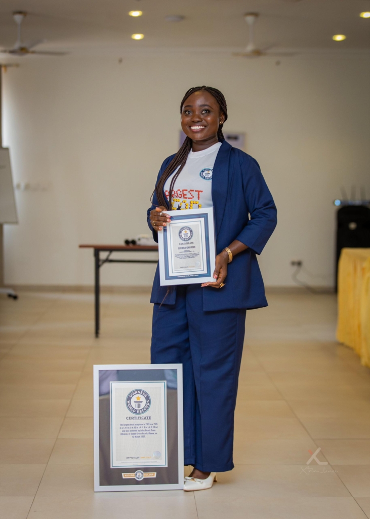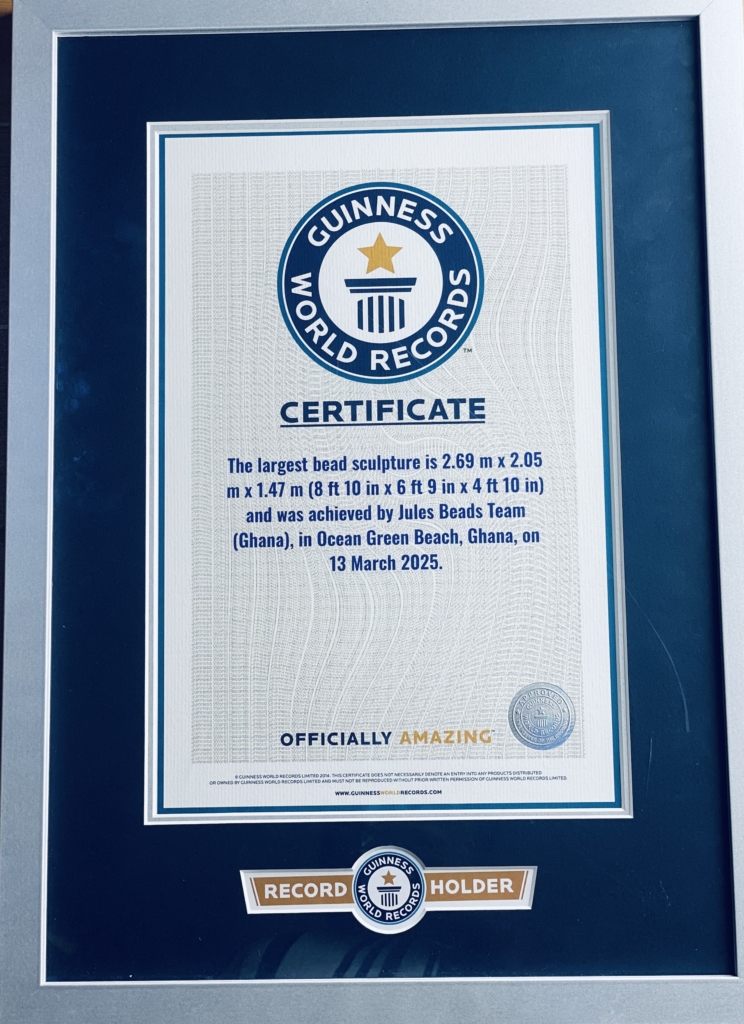A 33 year old Ghanaian creative, Juliana Gharbin, together with eight professional beadmakers, has set a Guinness World Record for the Largest Bead Sculpture, placing Ghanaian bead artistry on the global stage.