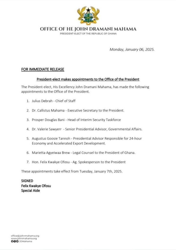 President-elect John Mahama has announced a series of high-profile appointments to the Office of the President as he prepares to assume office.