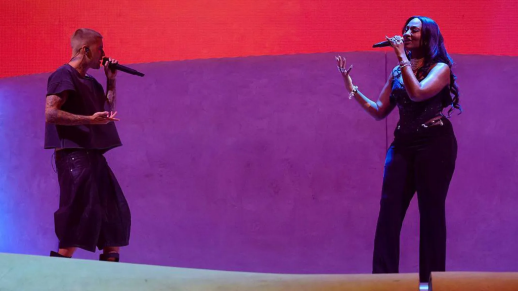 Dressed in a hoodie and shorts on a stripped-back stage, Bieber was joined by musical guests including The Kid Laroi, Wizkid, Tems and Dijon.