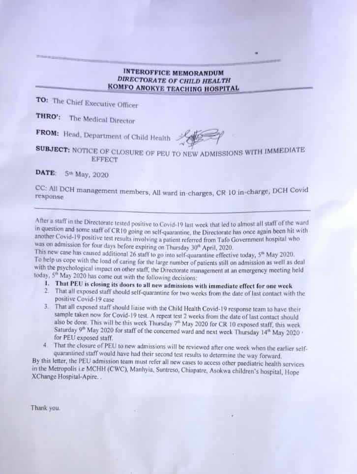 In a communique cited by JoyNews, the Head, Department of Child Health said the new case has caused additional 26 staff to go into self-quarantine effective today May 5, 2020.