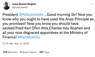 Renowned economist Kwame Pianim, a stalwart of the NPP, also urged the president to fire Ofori-Atta. As a result, it is only logical that the reality on the ground was reflected on Twitter.