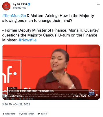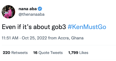 The hashtag #KenMustGo was born on 2 July 2022, a day after Ghana announced its decision to go back to the IMF. The hashtag was first tweeted by @ObengAppah. The hashtag took off on Twitter and frequently held the top spot on Ghana’s Twitter trends.