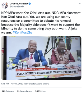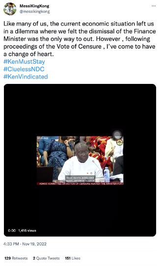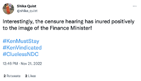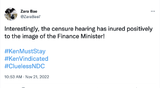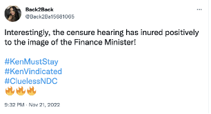 The message: “Interestingly, the censure hearing has inured positively to the image of the Finance Minister! #KenMustStay #KenVindicated #CluelessNDC ”.