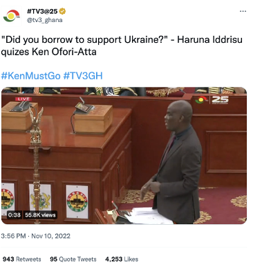 The most retweeted tweet was sent out by @tv3_ghana on 10 November 2022. The tweet garnered 943 retweets and 4,253 likes.