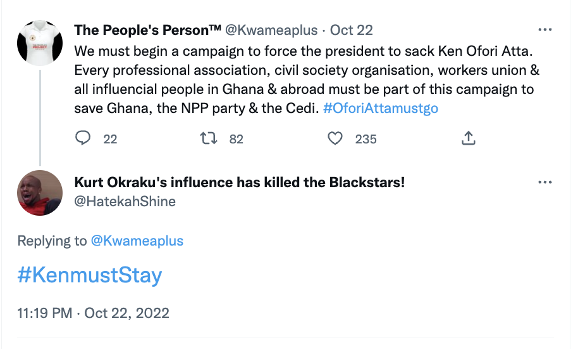 In the heat of the clamour for the resignation or sacking of the finance minister, musician/social media activist Kwame APlus tweeted “we must begin a campaign to force the president to sack Mr. Ken Ofori-Atta. Every professional association, civil society organization, workers union and influential people in Ghana and abroad must be part of the campaign”. An unidentifiable Twitter user @Hatekahshine responded, #KenMustStay on 22nd October 2022. This marked the beginning of the counternarrative #KenMustStay.