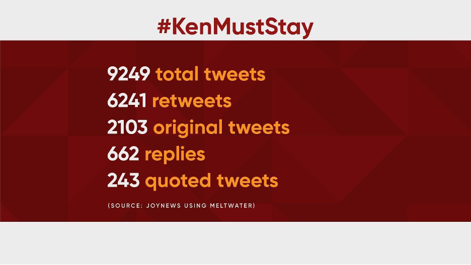As of December 8, 2022, 292 people generated 9,249 #KenMustStay tweets. 2,103 of the tweets were original while 6241 of them were retweets. #KenMustStay users frequently added additional hashtags, such as #KenVindicated #TrustKenToDeliver #KenNyameSombo. Users intensified their tweets on the first day the parliament ad-hoc committee sat to hear the censure motion against Ofori-Atta, that was filed by the minority in parliament.