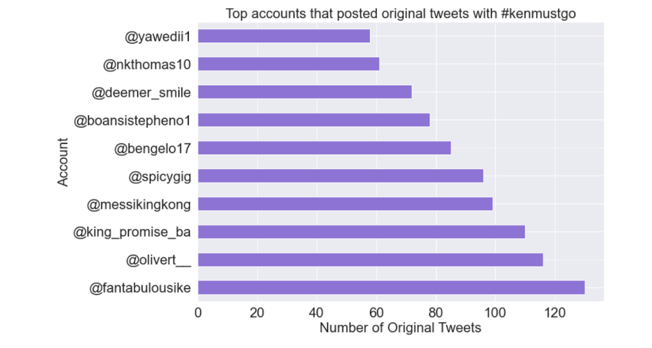 The #KenMustGo conversations on Twitter appear to be relatively organic. The hashtag was tweeted by over 9,600 Twitter users. The political characters that drove this narrative on Twitter are well known and as members of the opposition, their stance on the matter is understandable. The opinions expressed in the tweets by the media personalities who also drove this narrative on Twitter mirrored what appears to be the general sentiments of most Ghanaians at the time.