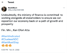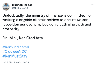 The message: “Undoubtedly, the ministry of finance is committed to working alongside all stakeholders to ensure we can reposition our economy back on a path of growth and prosperity Fin. Min., Ken Ofori-Atta #KenVindicated #CluelessNDC #KenMustStay”. This appears to be a quote from the Finance Minister when he appeared before the ad hoc committee set up to consider the motion for his censureship.