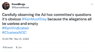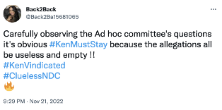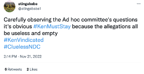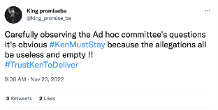 The message: “Carefully observing the Ad hoc committee's questions it's obvious #KenMustStay because the allegations all be useless and empty !! #TrustKenToDeliver ”.