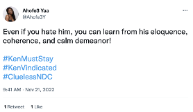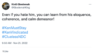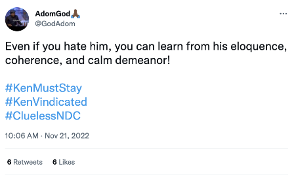 The message: “Even if you hate him, you can learn from his eloquence, coherence, and calm demeanor! #KenMustStay #KenVindicated #CluelessNDC ”.