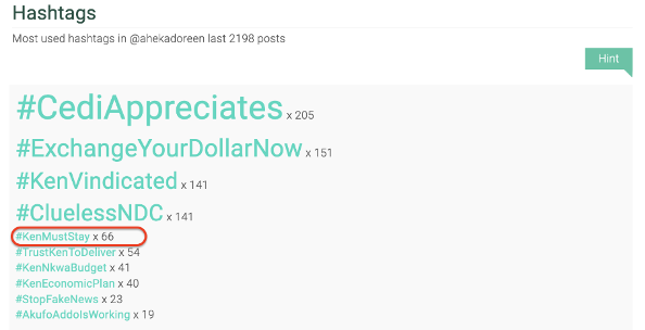 An analysis on #KenMustGo revealed that Atta received a lot of Twitter mentions whenever the cedi underperformed and fuel prices spiked. Many tweets suggested that the finance minister should resign because he promised never to seek a bailout from the IMF but was forced to go back on his words.