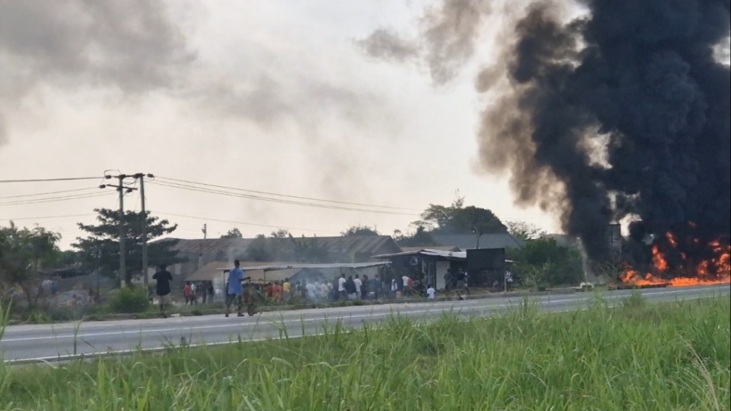 According to eyewitnesses, the truck, which was traveling from Accra towards Suhum, attempted to overtake a fuel tanker but lost control and fell on its side in the middle of the road.