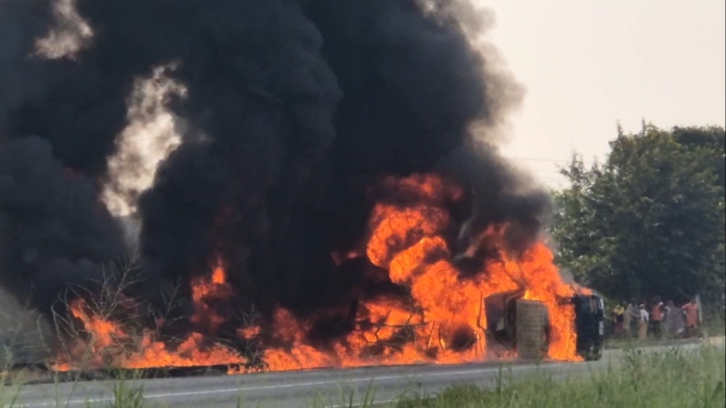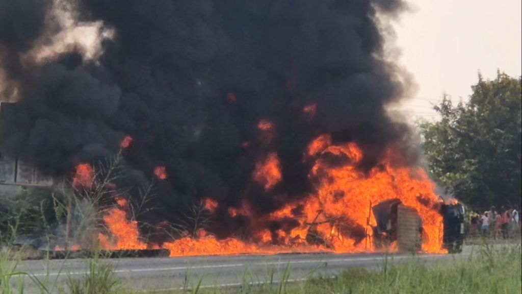 An eyewitness recounted, “This morning while heading to work, I saw people gathered around the truck. Its tire had burst, and we noticed smoke coming out. Before we could get close, the truck burst into flames. Fortunately, the driver and his mate were taken to the hospital.”