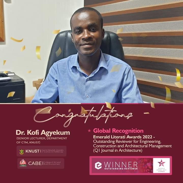 The Editorial Team of Engineering, Construction and Architectural Management (ECAM), a Q1 Journal in Architecture hosted by Emerald Publishing has selected Dr. Kofi Agyekum of the Department of Construction Technology and Management, KNUST, as one of the three global recipients for the outstanding reviewer award.