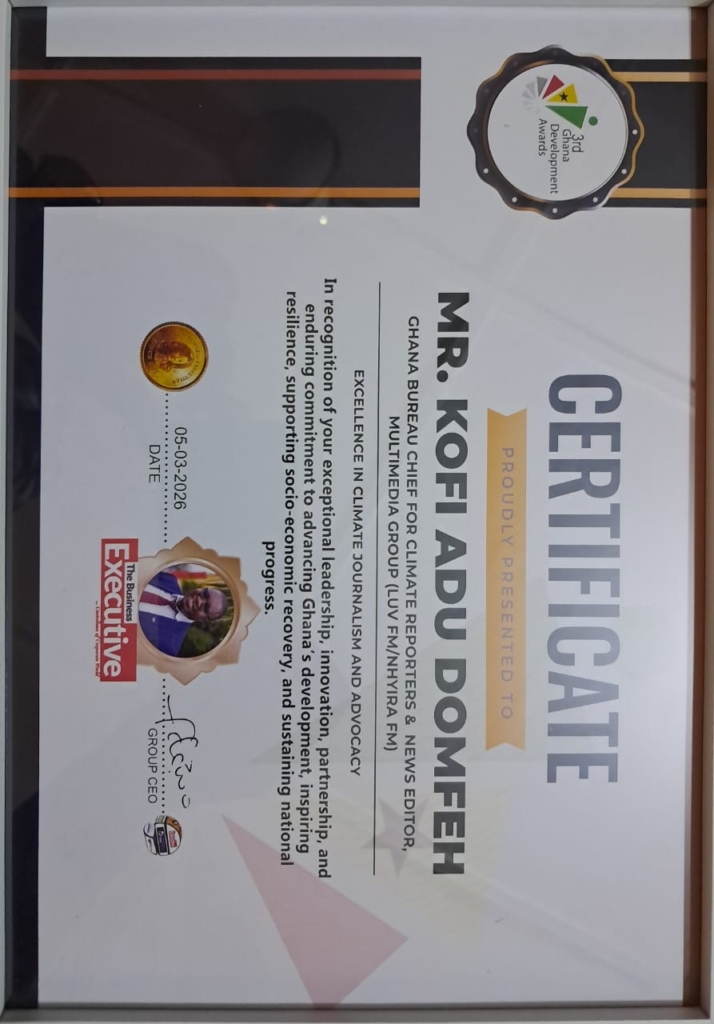 Multimedia journalist and Climate Reality Leader, Kofi Adu Domfeh, has been honoured with the Excellence in Climate Journalism and Advocacy Award.