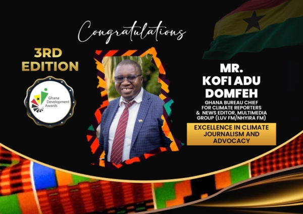 Multimedia journalist and Climate Reality Leader, Kofi Adu Domfeh, has been honoured with the Excellence in Climate Journalism and Advocacy Award.