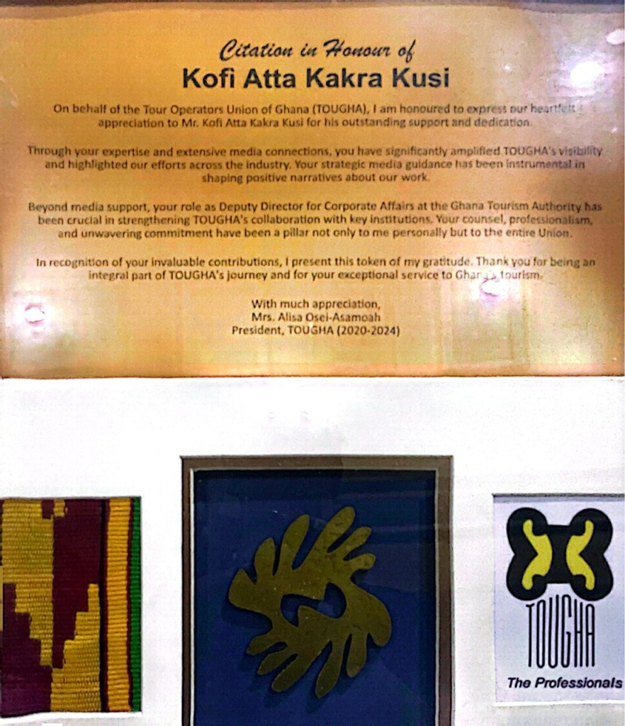 In a heartfelt moment of recognition, Kofi Atta Kakra Kusi, Deputy Director in charge of Corporate Affairs at the Ghana Tourism Authority (GTA), was honoured last night for his exceptional contributions to the Tour Operators Union of Ghana (TOUGHA).