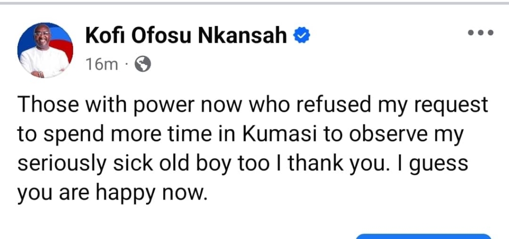“Those with power now who refused my request to spend more time in Kumasi to observe my seriously sick old boy too I thank you. I guess you are happy now,” he wrote.