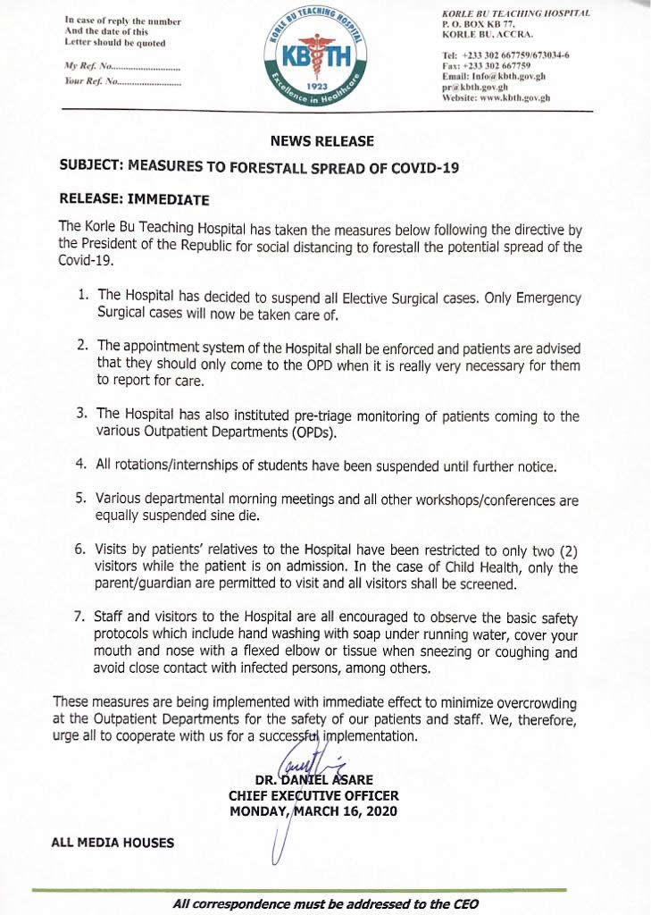 Korle Bu Teaching Hospital has announced the suspension of elective surgical cases in a bid to minimise overcrowding and forestall the spread of the new coronavirus.