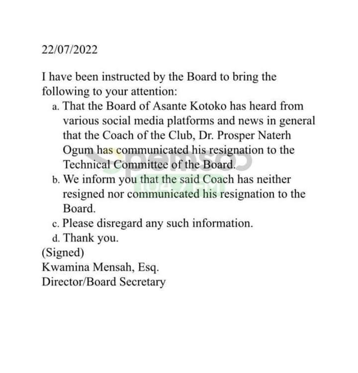 Ghana Premier League champions, Asante Kotoko, have issued a communique to refute reports of head coach Prosper Ogum Narteh resigning from his role as the head coach of the team.
