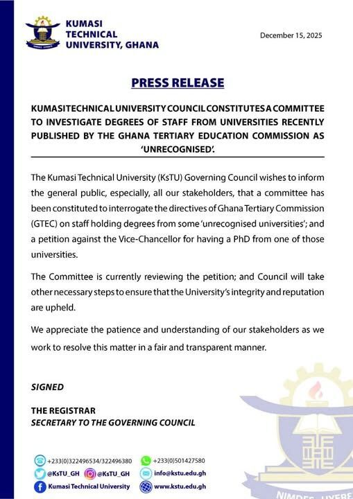 The Governing Council of the Kumasi Technical University (KsTU) has constituted a committee to review concerns arising from recent directives issued by the Ghana Tertiary Education Commission (GTEC) on staff who obtained academic qualifications from institutions classified as unrecognised.