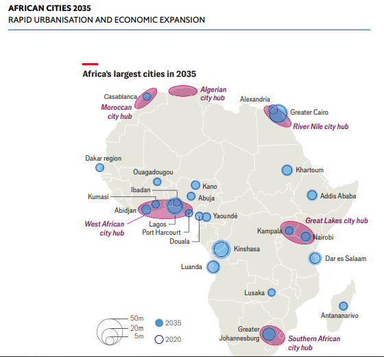 It said the continent is projected to have six megacities by 2035—Luanda and Dar es Salaam will join the current giants of Greater Cairo, Kinshasa, Lagos and Greater Johannesburg with a population of more than 10 million resident.