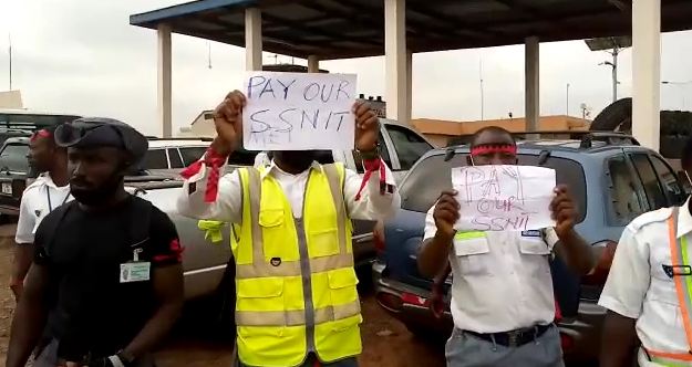 Workers of private security firm G7 Security System embarked on a two-hour strike against management of the Kumasi Airport after months of non-payment of salaries and social security contributions.