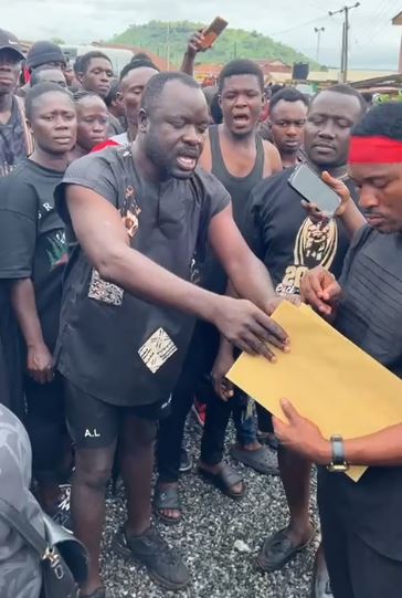 The youth, clad in red and black in their numbers, matched to the palace on Saturday, October 12, a day after Daasebre’s resignation, and presented their petition to the Queen Mother, Nana Adwoa Gyamfua III.