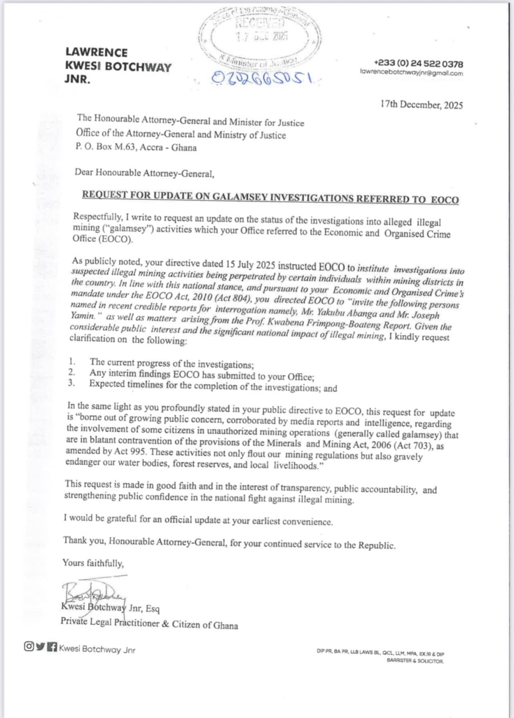 In a letter dated December 17, 2025, Mr Botchway stated that his request was motivated by strong public interest and the far-reaching national consequences of illegal mining, commonly known as galamsey.