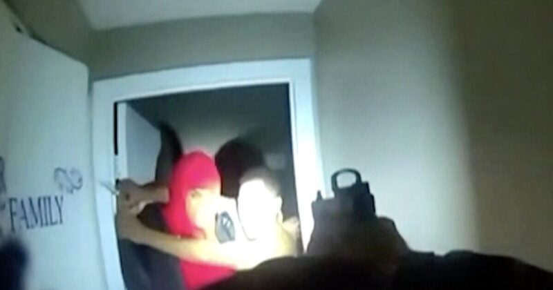 Body camera footage released by the police shows Mr Bookman walking through the home with his gun drawn while screaming and banging can be heard out of view.