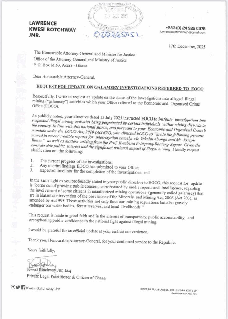 Private legal practitioner Kwesi Botchway Jnr has formally written to the Attorney-General and Minister for Justice, requesting an update on the status of investigations into alleged illegal mining activities linked to some known persons referred to the Economic and Organised Crime Office (EOCO).