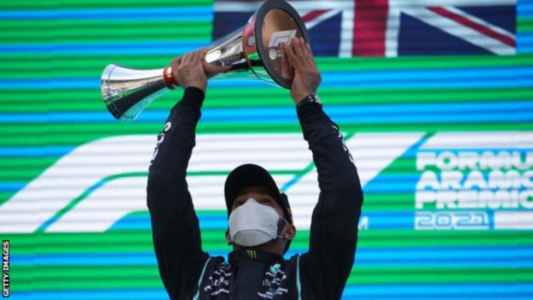 Hamilton's victory was the 98th of his career, after he set his 100th pole position on Saturday, and it extends his championship lead to 14 points.